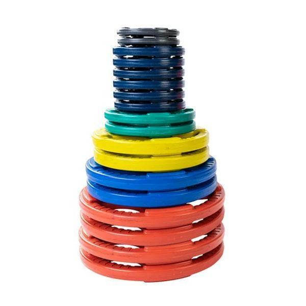 Encased in durable, heavy-duty rubber to prevent scuffing or damage to equipment, walls or floors. Impact-resistant, these Olympic Plates will not split, crack or peel. Quad-grip design guarantees safer and easier performance than any other plate on the market. They are also impervious to rusting, chipping, flaking or losing their color. And the integrated metal sleeve provides a smooth, secure fit onto any Olympic bar.Â