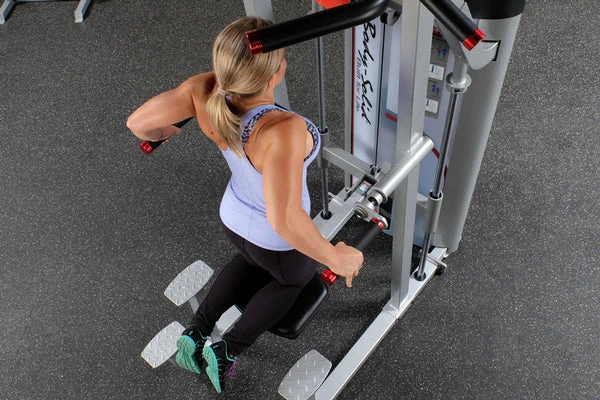 Body-Solid’s Weight-Assisted Chin Dip Machine allows users to perform dip, chin-up and pull-up movements more easily and effectively by counterbalancing the user’s bodyweight. The S2ACD is available with a 235lb weight stack. This counterbalanced weight allows for full range of motion, perfect repetitions and proper form regardless of the user’s current fitness level. The S2ACD features two wide lat pull-up grips, both neutral and traditional for exercise variety. The unique close grip chin up bar folds out of the way for the other exercises and also features both a neutral and traditional hand grip positions.
