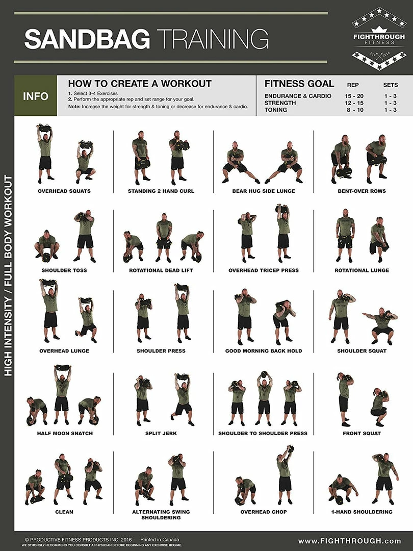 Sandbag High Intensity Exercises – Full Body Laminated Workout Poster / Chart – Strength & Cardio Training – Core – Chest – Legs – Shoulders & Back – Build Muscle, Tone & Tighten – Body Building & Fat Loss With Sandbag Training – 18”x24″ by Fighthrough