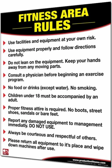 The new Fitness / Exercise room rules chart has been created as a “must have” in any unsupervised fitness facility. Ideal for apartment complexes, hotels, and workplace gyms The Fitness Area Rules poster will help to mitigate liability from accidents or injuries; and will make users accountable for their own actions.