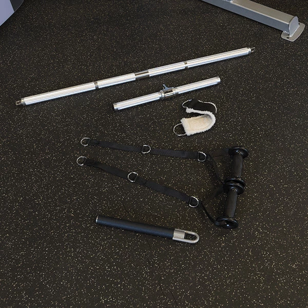 - Includes 43” revolving straight bar, 14” athletic bar, 2 nylon cable handles, ankle strap and straight bar