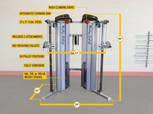 Unlock a near-unlimited amount of workout possibilities with the Body-Solid S2FT Series II Functional Training Center. The S2FT’s dual independent weight stack system provides dedicated resistance with true isolateral movements from cable crossovers and shoulder presses to pull-ups, leg kickbacks and everything in-between. The pulleys adjust independently offering 34 different starting positions.