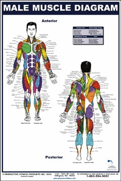 This vibrant poster uses various shades of color to distinguish muscles in the male body. Superficial and deep muscles, as well as front and rear views, are shown.