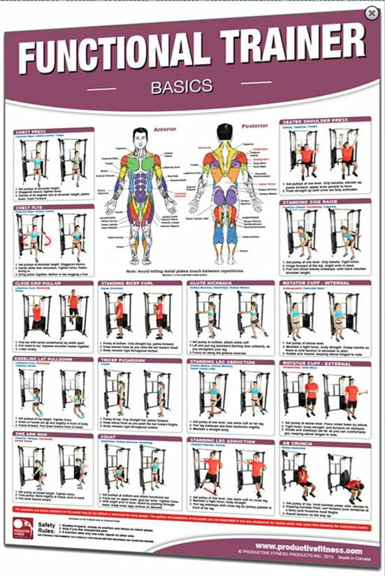 This poster features 16 basic exercises that can be done on a functional trainer gym. Get a great workout for the chest, shoulders, back, triceps, biceps, abdominals, legs and calves. All exercises are clearly explained with step-by-step instructions and descriptive photos.