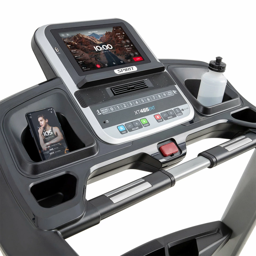 The Spirit Fitness XT485ENT Folding Treadmill is the perfect mix of features and function. With a large 10.1” touchscreen display you can easily navigate through the 30+ on-board programs and workout controls. Preloaded apps like Netflix, YouTube, CNN, and more, as well as built-in screen mirroring capabilities and a USB charging port offer endless entertainment or motivation opportunities so you don’t miss a beat. Built-in Bluetooth FTMS lets you connect to apps like Zwift and Kinomap, connect to your headphones, or an external heart rate monitor. The powerful 4.0 HP motor backed by a lifetime warranty will get you moving up to 12 mph on the generous 22” x 60” running surface. Need extra room? The Spirit Fitness XT485ENT packs all of this into a convenient folding-frame design with built-in transport wheels that makes moving and storage a breeze.